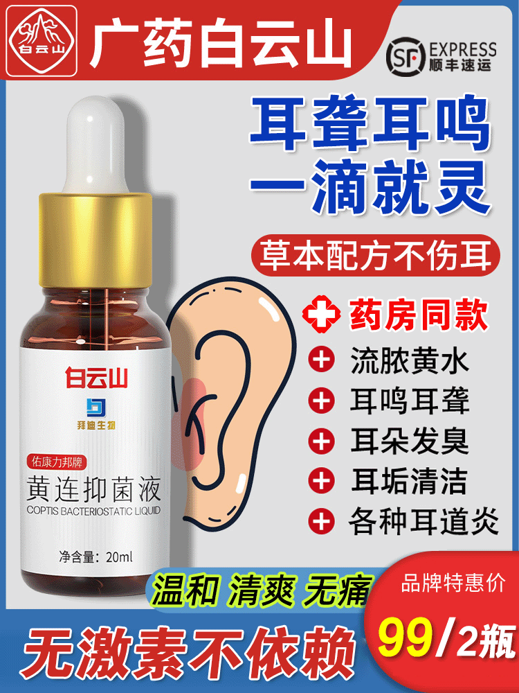 5分钟前【白云山滴耳液】耳鸣耳聋一滴就灵,修复耳膜预防疾病 - 【活动套餐】(推荐轻度患者使用)白云山黄连抑菌滴耳液 买1送1 共2瓶 99元